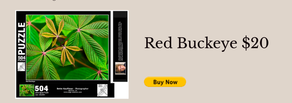 “Red Buckeye” was created as a puzzle to be put together online on the Jigsaw Planet website. It was a very popular puzzle. More than 2000 people put it together online in the several months it was available there. Now you can have it for your own or give it as a gift to the puzzler in your life.
