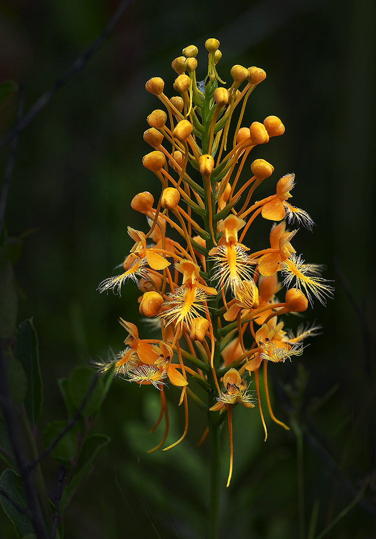 Me? Orchids! Wild orchids. Like these Yellow Fringed Orchids (Platanthera ciliaris), and their cousins, Yellow Fringeless Orchids (Platanthera integra). The latter species are actually yellow, as opposed to orange, and they lack the long eyelashes you see above. But they are lovely if less showy than the fringed ones.