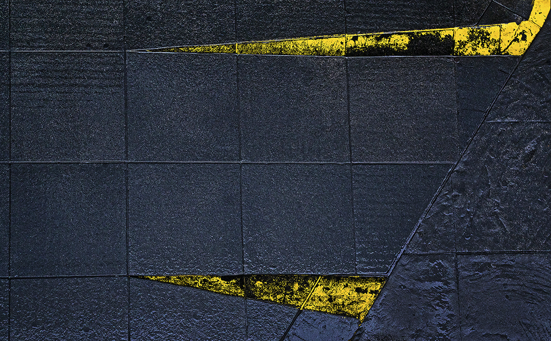 It’s a wet Chicago sidewalk, and I am standing on an L train platform leaning over the edge to shoot straight down. The worn, scratched yellow areas are shallow curbs painted to show that the sidewalk is not level. That area between the yellow marks is a ramp to accommodate wheelchairs and walkers. Notice that from the perspective I forced on you, the fact that the surface you are looking at is not level is pretty much hidden.