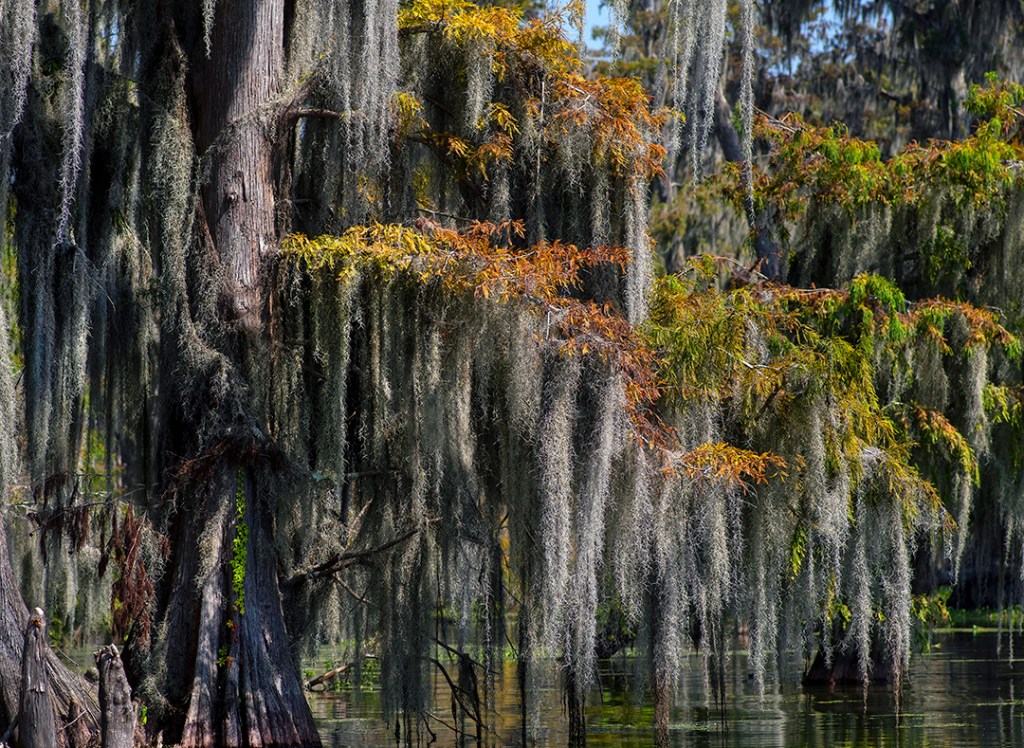 Bald Cypress trees always fascinate with their fluted trunks and feathery leaves. In early October, those leaves are turning yellow and copper, and the colors are made more intense by contrast with the curtains of gray Spanish moss that drape from every branch.