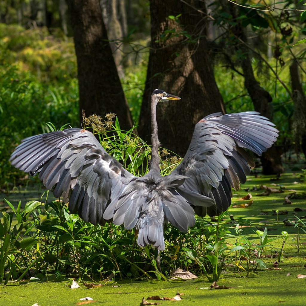 Majestic great blue herons were the most plentiful. I was fortunate to capture one about to take flight. Generally speaking, I prefer to compose one frame at a time. But for a shot like this of moving wildlife from a moving boat, at least medium speed multi-frame shooting makes all the difference.