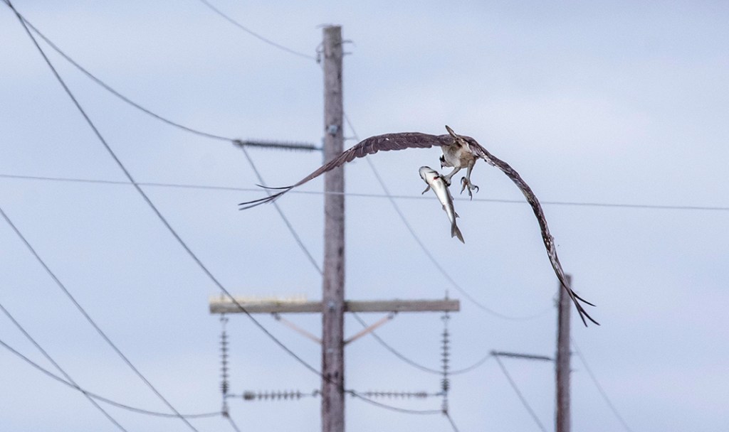 I got one shot through the windshield. The bird flew, and it was instantly clear that I had interrupted dinner. A large silver fish dangled from the osprey’s talons.