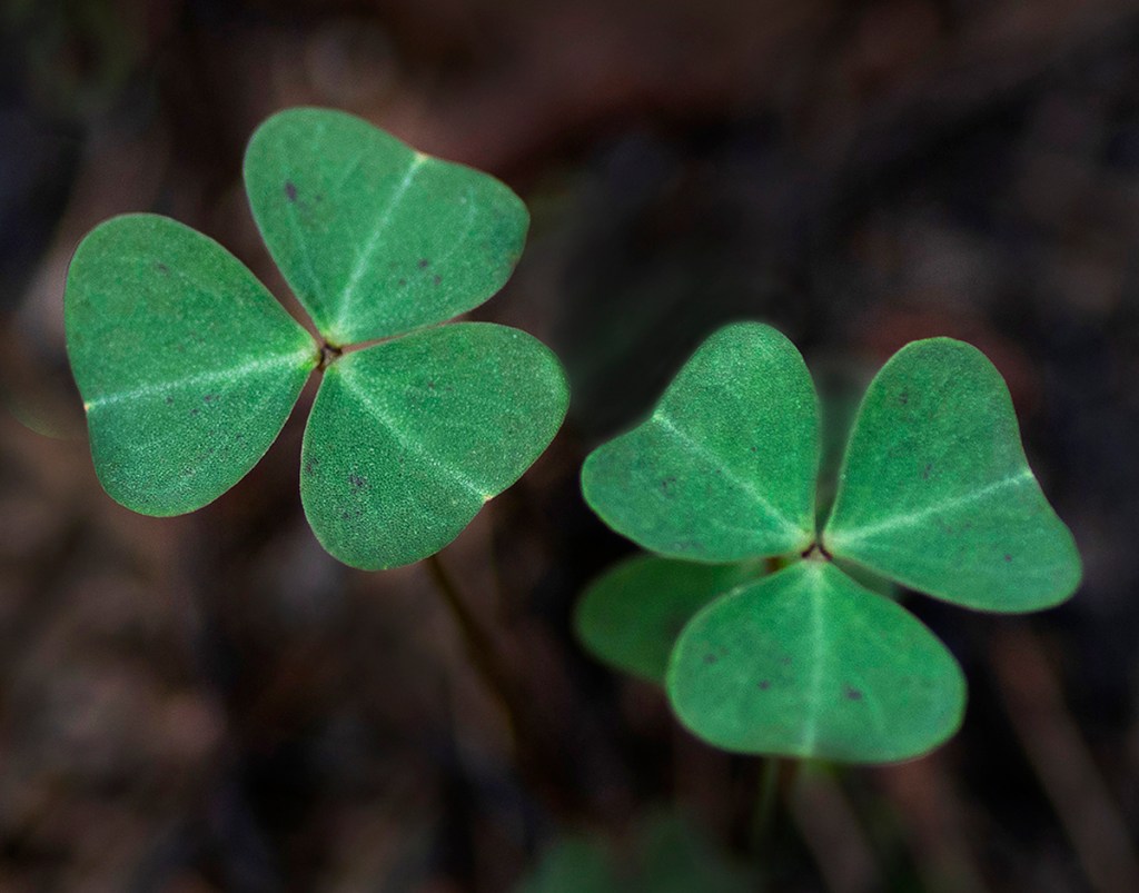 A quarter would cover each of these sets of leaflets of three. The flower that rises on a leafless stalk nearby is even smaller: Cover it with a dime!