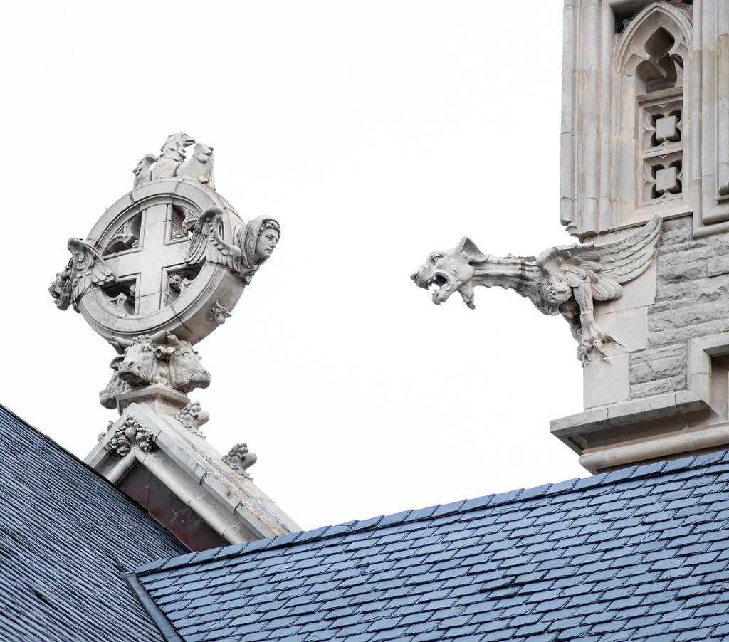 Don’t you wonder about the symbolism incorporated in buildings? Maybe especially ones having religious purposes? What do you suppose is the meaning of cow heads forming the base of a Celtic cross? And a bearded and bosomed yapping dog gargoyle nearby?