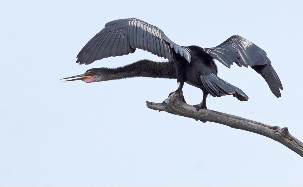 After being submerged for awhile, anhingas perch in trees and spread their wings to dry. But this bird is calling. That pink chin is hard to see until the bird arches its wings, stretches its neck, inflates the chin pouch and issues a gutteral call. To hear the call, go to YouTube and search for “anhinga call.”