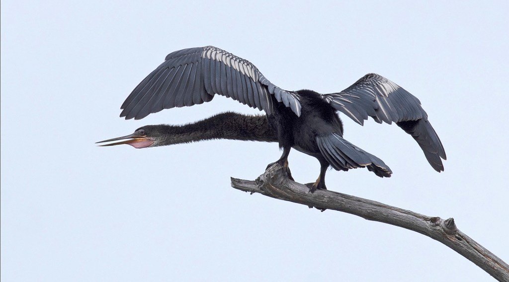 Anhingas fascinate me. They are diving, fish eating birds that move through the water completely submerged except for the head held out of the water by that long neck. Swimming, they look more like a snake than a bird! When they come out of the water, they perch and spread their black wings with dramatic white markings to dry. And to make their gutteral cry, they extend and kink their neck at the same time and a pink dewlap appears.