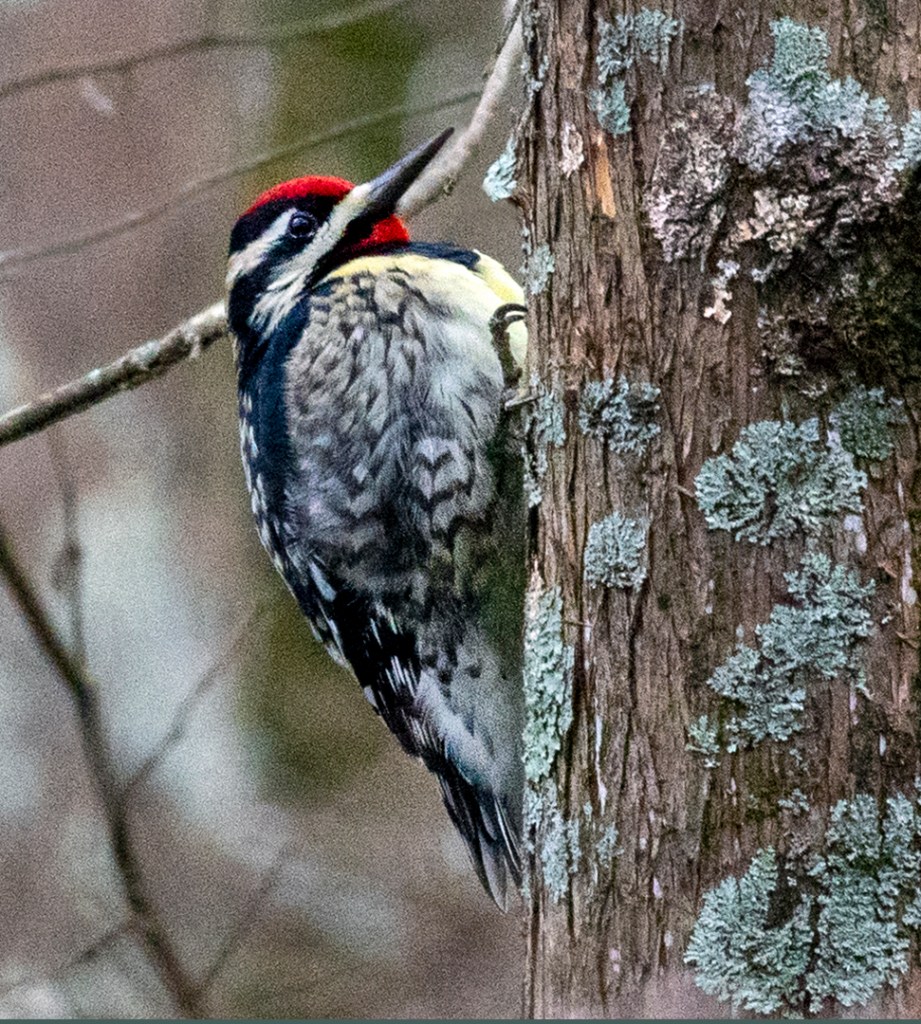 I came home from that day with a number of decent bird shots, but this Yellow-bellied Sapsucker (Sphyrapicus varius) is the best. We first heard the sound of the bird drumming the rows of holes in the trunk of a tree that are so characteristic of this species, but it didn’t take long to spot that colorful head just off the boardwalk leading out to the observation deck.
