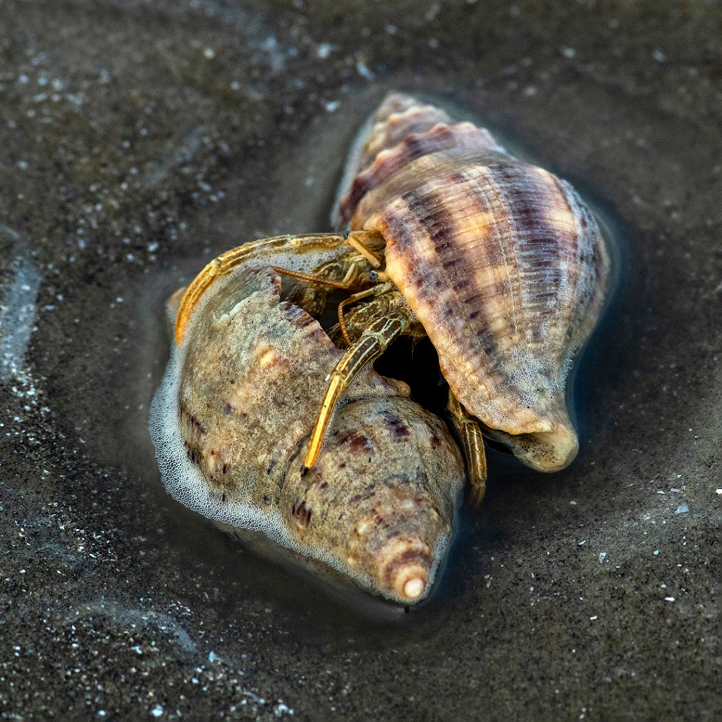 And then I noticed two shells in a depression in the sand that seemed to be “facing” each other, a slightly odd thing to say since shells don’t exactly have “faces.” Had one of them moved? I wasn’t sure but maybe…. So I stood very still and watched. Sure enough! Legs emerged from one of the shells, embraced the other shell and pulled it closer. Awwww! Hermit crab love!