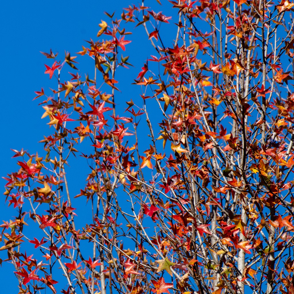 So sweetgums are a bit of a “good news, bad news story.” But if you’re driving home on a bright Sunday afternoon looking for glory, you can’t do better than flaming leaves of sweetgum against an intense blue sky.