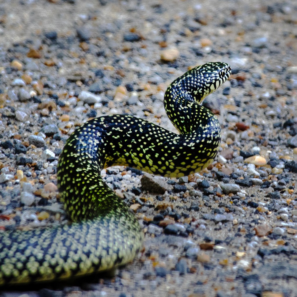 Much to my relief, I had not hit it, but I had certainly alarmed it. But, wow! It was a Speckled Kingsnake (Lampropeltis holbrooki)n and my first, and only so far, encounter with one in the wild. This is not only a beautiful snake but a very beneficial one, being non-venomous and eating, among other things, venomous snakes. I clicked madly away until the snake calmed down, lowered its head and continued on its way across the road. I and a photographer friend who had approached from the other side of the snake stood by and waved off vehicles until it had safely made it to the other side.