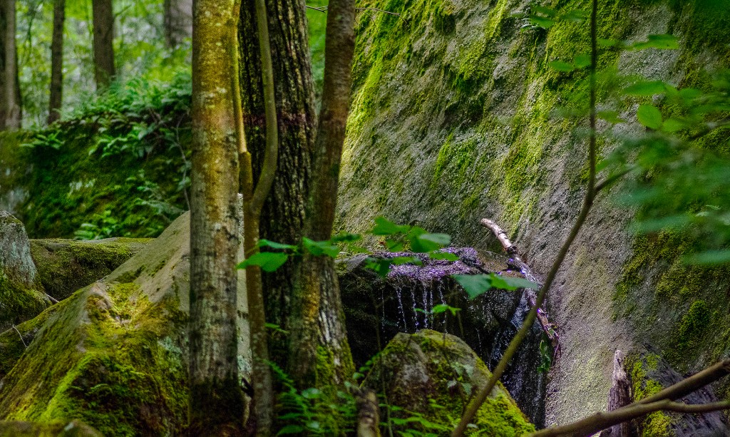Wow! What an amazing place. And I saw only a tiny fraction of it. I was blown away by the sheer rock walls, the tumbled boulders, the waterfalls, the moss and lichens, the Mountain Laurel, the trees, and more. The North Country National Scenic Trail runs through the Allegheny, so rather than merely cross it, I parked and walked on it for maybe a half a mile. Just a few yards from the trailhead, I came upon a wooden box on a post containing a register and pens in a plastic bag. There’s a great sense of connection and community in reading a few comments of those who walked that way before, and leaving your own for those who come behind. Signing my name felt honorable.
