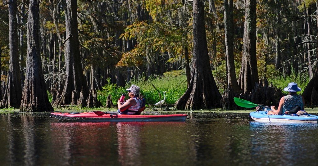 These are my friends Lori and Beth. We went for a paddle on Bayou Desiard that runs through my adopted hometown. A bayou is not a river or stream or creek. It is a long, skinny stretch of slow-moving water. This stretch is bordered on both sides by magnificent cypress trees, which look like evergreens but aren’t. Just above Lori’s head, the needles are turning a beautiful coppery red gold.. They will ultimately all fall into the water, staining it the same color.