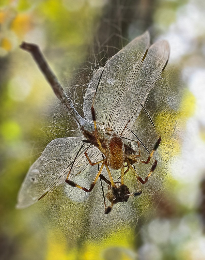 BTW, in the interest of transparency, the swirl pattern especially visible on the spider’s abdomen and the dragonfly’s wings is a filter I added to this photo. I don’t often mess with my photos like this, but I was experimenting and liked it, plus it enabled me to enter the photo in a competition for “Artistic” nature photos. Indeed, it won!