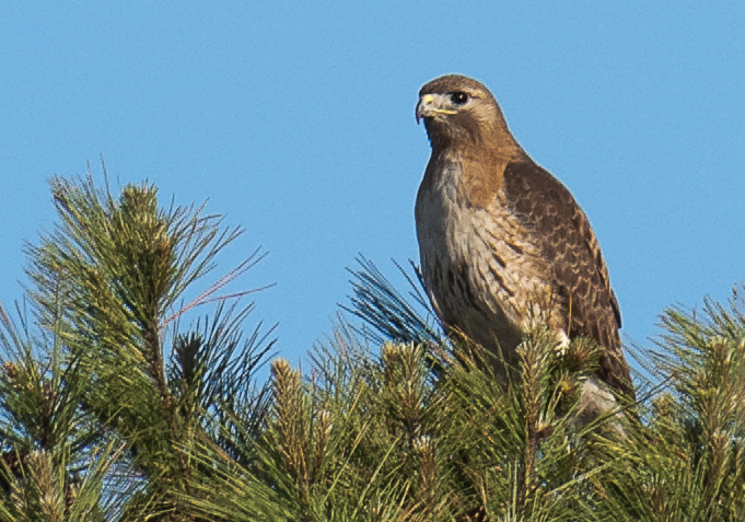 On this day we saw a Kingfisher in action, Mallards on the water, a Great Blue Heron in a tree, Northern Rough-winged Swallows swooping about, and more. But my fave was this magnificent Red-shouldered Hawk at the top of a pine tree just as we were about to leave the park!