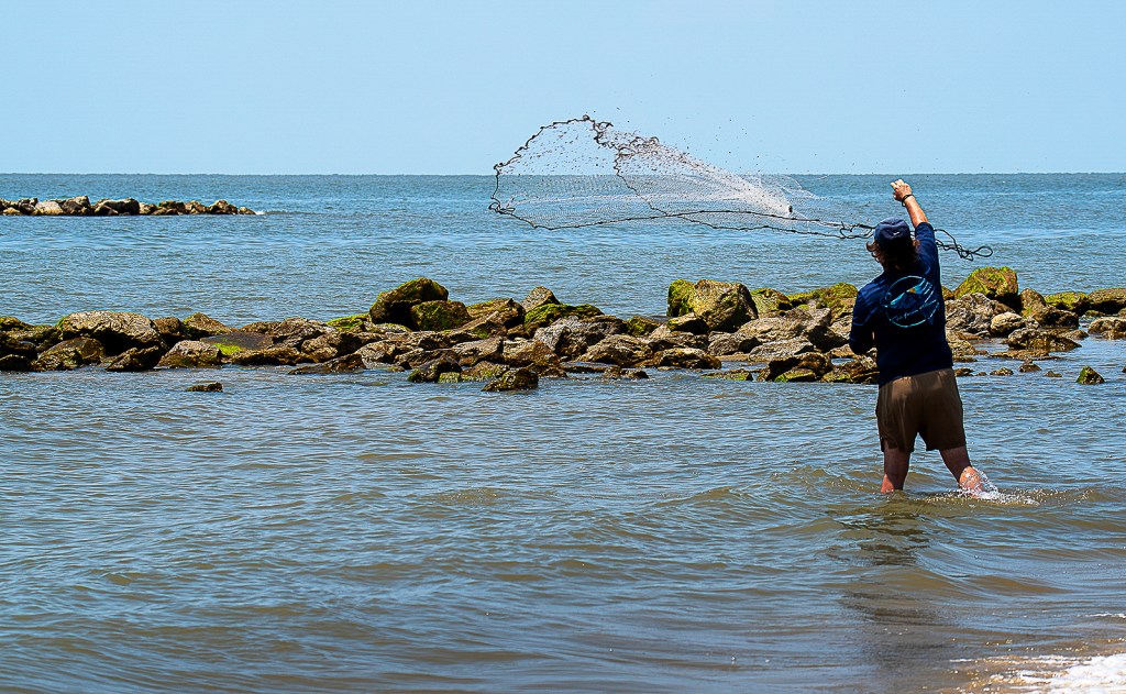 Have you ever tried cast net fishing? Place the loop at the end of the rope around your wrist, gather the rope in short loops hanging from the same hand, grasp the net at its center with weighted skirt hanging down. Hold out the edge of the skirt with your other hand. Now, turn from your hip and throw! Better, find a Cajun fisherman to teach you! The Gulf of Mexico yields its nutritious wealth to the skilled danseuse du filet.