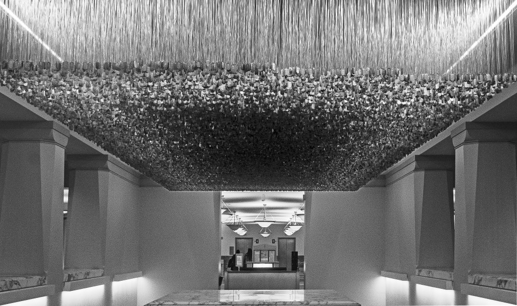 It is quite pretty from below. So, look up as you climb the central staircase of the public library of Chicago. When you get to the top, pause. Consider. Reflect. Witness recompense for human folly, measured in dog tags, a pair for every U.S. soldier who died in Vietnam.