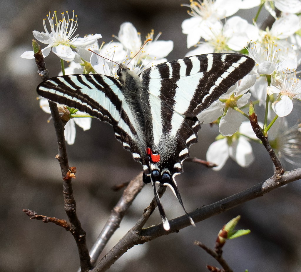 The Zebra Swallowtail is what is known in the butterfly world as a “specialist.” The adults nectar on a variety of white, open-throated blossoms, like the wild plum (Prunus species) in the photo above. But the caterpillars will eat only Pawpaw, thus the adults deposit eggs only on Pawpaw trees (Asimina triloba).