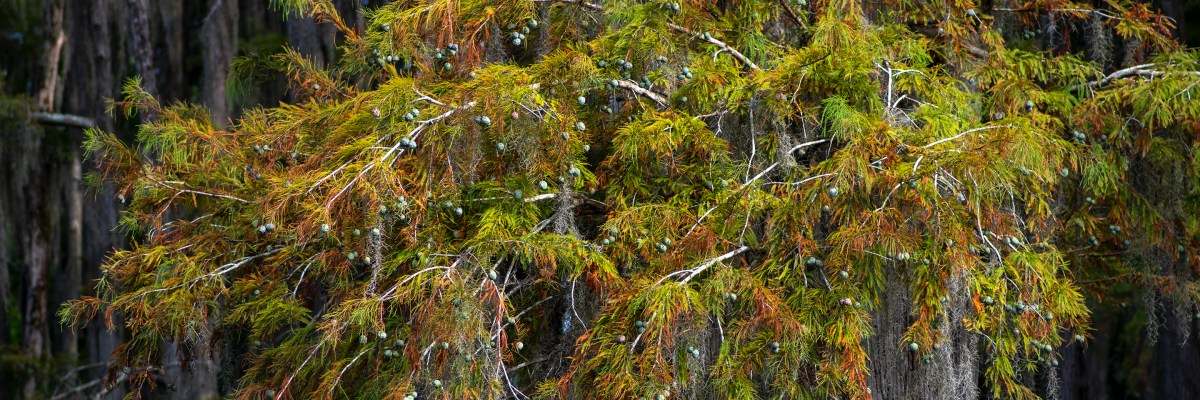 Since moving to the south twenty-some years ago, I have said and even more often looked at a bald cypress tree and thought, “Who needs Christmas trees when you have cypress trees?!” They are, in and of themselves, a sign of the south. In the early fall, when their “leaves,” which look like evergreen needles but aren’t, begin turning a brilliant coppery red, they are signs of coming winter. And for those of you who think we don’t have winter, just know that last night, it was colder in Louisiana than it was in Missouri. So there! See all those…