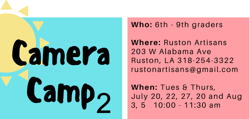 The kids took some good photos. We all had fun. I’m going to do it again! My first ever “Camera Camp” offering ended last week. This Camera Camp was kind of a private affair, offered only to 6th through 9th graders of Grace Episcopal Church and School. The next one will be run through Ruston Artisans Gallery and Co-op at 203 W. Alabama Ave. in Ruston. It begins July 20 and runs through August 5. We will meet Tuesdays and Thursdays 10 – 11:30 at the gallery. Each of the kids who came to Camera Camp showed commitment and skill,…
