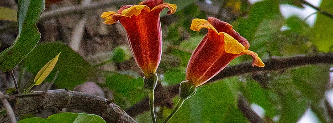March 16, 2019. It’s Saturday of Louisiana Master Naturalist’s annual 3-day meeting called “Rendezvous.” This year we met in Fountainbleau State Park on the north side of Lake Pontchartrain. Fountainbleau has a lot to offer naturalists. It’s also ideal habitat for cross vine (Bignonia capreolata), one of my fave native plants. I began looking for its distinctive sets of four leaves, actually two pairs of two leaves, going up the straight trunks of trees long before I saw a flower. But when I finally did see a flower? Wow! I thought immediately of Tom Wolfe’s book, The Kandy-Kolored Tangerine Flake…