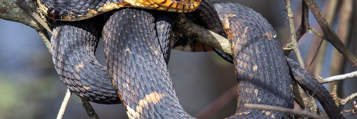 A few of my friends will not be able to look at this one, and to them I apologize. I do understand, as my own tendency to recoil in horror at the sight of a snake, even a photograph of a snake, once was quite strong. I am featuring this photograph of a magnificent broad-banded water snake (Nerodia fasciata confluens) in part to celebrate the progress I have made in confronting and overcoming that fear. That does not mean I pick up snakes in the wild. Far from it. But I do look for them and try to get close…